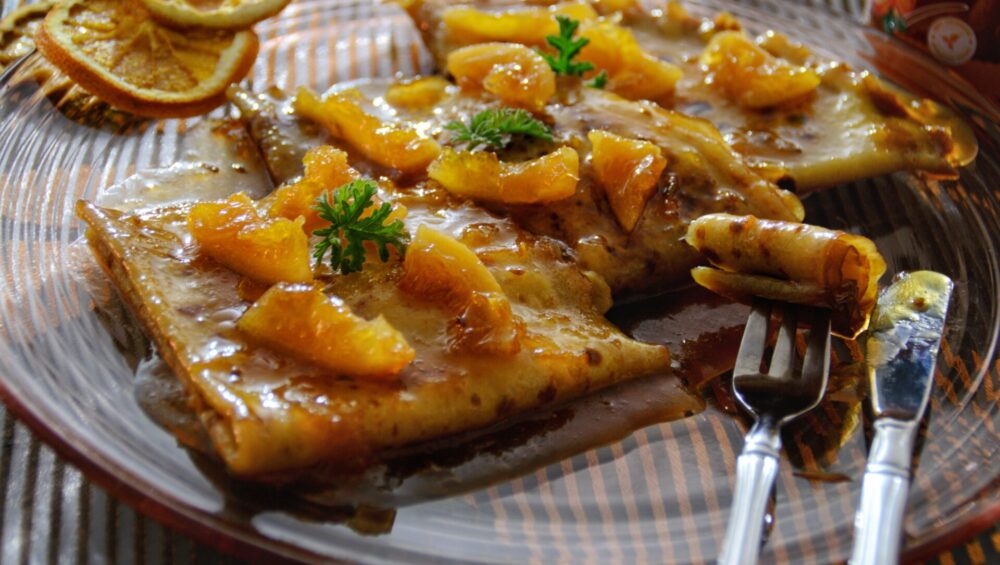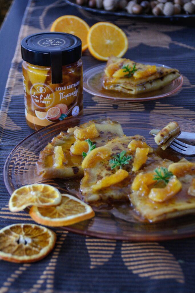 Αφού πάρουν μια βράση όλα μαζί διπλώνουμε τις κρέπες 2 φορές την καθεμία σχηματίζοντας τρίγωνο και τις προσθέτουμε στο σιρόπι. Αφήνουμε τις κρέπες να βράσουν και να τραβήξουν καλά το σιρόπι για 2-3 λεπτά. Σ’ αυτό το σημείο αν θέλουμε προσθέτουμε τα φύλλα αρμπαρόριζας. Αφού τις  κατεβάσουμε από τη φωτιά αφήνουμε για 1′ να σταθούν και σερβίρουμε γαρνίροντας με τις φέτες από το γλυκό πορτοκάλι  και αρκετή σάλτσα.
